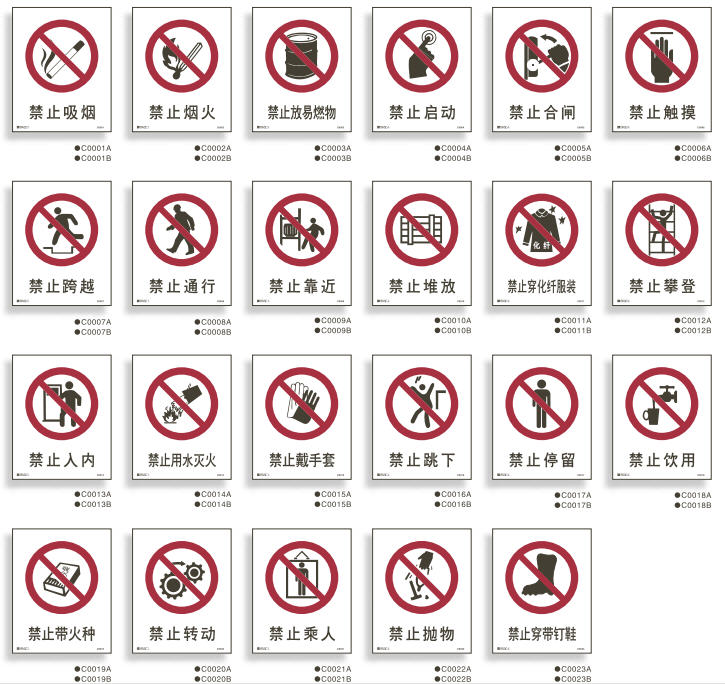 禁止类标识包含禁止吸烟、禁止抛物、禁止通行等多种图形标志,用于禁止人们的不安全行为。