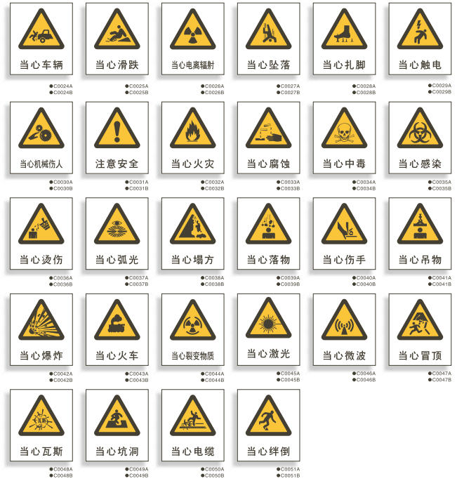 警示类中国国家标准标识遵循中华人民共和国国家标准GB 2894中关于警示类标志的规定,该标准提醒人们注意不安全因素、防止事故发生。适用于工矿企业、建筑工地、厂内运输和其他有必要提醒人们注意安全的场所,达到方向指示,提醒员工以预防危险等等的目的。贝迪为您提供了应用广泛的标准标识来帮助您创造一个安全的工作场所。 警示类标识包含当心车辆、当心烫伤、当心爆炸等多种图形标志,用于提醒人们对周围环境引起注意,以避免可能发生的危险。